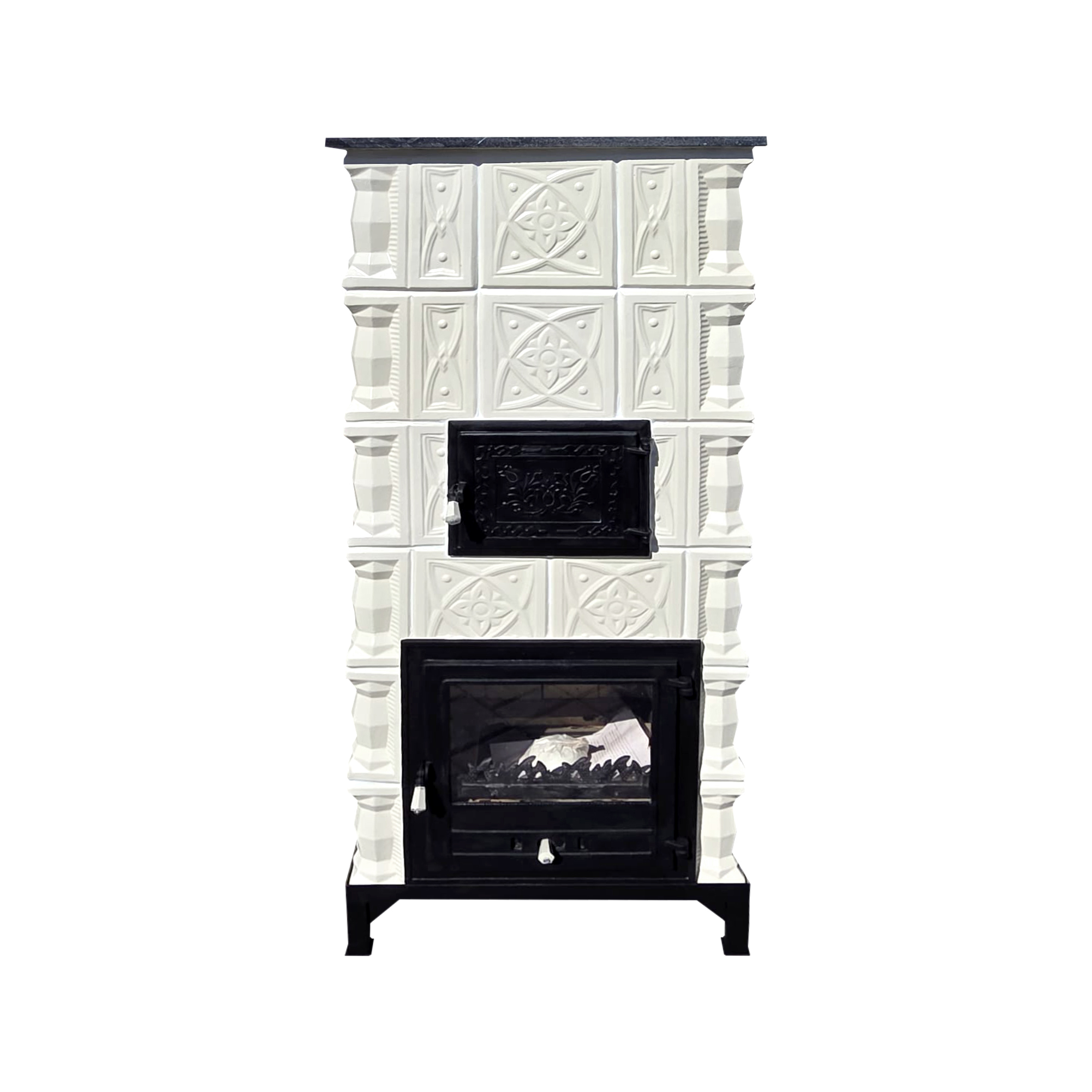 Făurit în spiritul sobelor tradiționale, acest Semineu teracota Gospodarul 6 randuri diamant alb cu cuptor reprezintă o operă de artă, o soluție excelentă pentru încălzit și gătit cu un bun randament termic, la un consum scăzut de combustibil. Cu o suprafață radiantă de 3,2 mp, acest șemineu are o capacitate de încălzire impresionantă. Construit pe un cadru solid din elemente de fier forjat de 5 mm grosime, cu fiecare cahlă de teracotă căptușită cu cărămidă refractară, focar dublu șamotat, ușă mare cu sticlă, evacuare la spate pe ștuț metalic de 4 mm grosime, lucrat cu adeziv și chit rezistente la temperatură, rezistență la transport/manipulare, dotat cu 3 fumuri și un focar impresionant, produsul Semineu teracota Gospodarul 6 randuri diamant alb cu cuptor este echipat și cu un cuptor pentru pasionații de prăjituri, având dimensiunile de L33/H22/l28 cm și fiind confecționat din tablă groasă de 0.8 mm. O creație unică în branșă, precum și o frumoasă piesă de mobilier ce poate împodobi casa dvs.